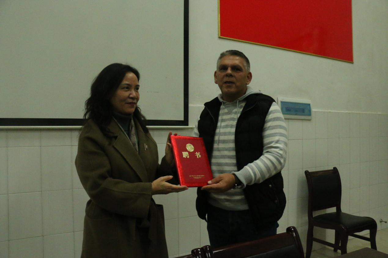 (湖南人文科技学院副校长石潇纯为米西奇颁发聘书)